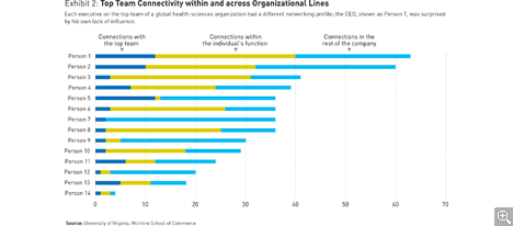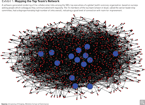 For example, in one global health-sciences organization with a reasonably well-functioning “senior leadership committee,” that top team — made up of 14 people — represented only 2 percent of more than 500 senior executives in the company. But they accounted for almost 15 percent of the collaborative and informal ties in the organization. (See Exhibit 1.) The robust ways in which these executives maintained working relationships through the company had a substantial impact on execution and performance.