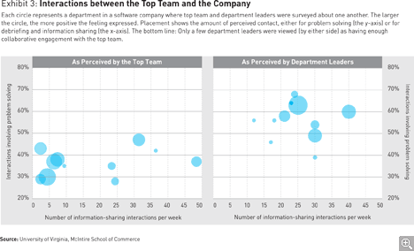 The top team consisted of about 25 executives with varied backgrounds. Some had been partners in major consulting firms; others had been entrepreneurs. Although they often met in subgroups or “kitchen cabinet” gatherings that formed naturally, these seldom functioned with real-team rigor, because the emphasis was on company politics rather than the pursuit of shared performance goals. And although the full senior team conducted its formal sessions efficiently, it operated only as an information-sharing discussion group. Nonetheless, senior leaders spent 64 percent of their time, on average, in interactions with one another, rather than with their own direct reports, the broader employee base, or even key clients. The leadership team’s aloofness, from one another and from their direct reports, had resulted in an invisible but pervasive and costly level of anxiety throughout the company. Fearing public reprimand, private reprisal, and the career consequences of taking risks, employees directed routine questions and problems up the hierarchy. Peer-to-peer interactions were increasingly tense and constrained.