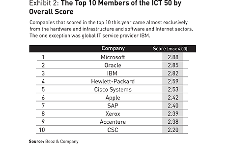 Where financial performance is concerned, the ICT 50 analysis confirms that one prevailing assumption of the past decade — “service rules” — no longer holds true. None of the top five financial performers were IT service providers or telecom operators. The software and Internet companies Microsoft, Google, and Oracle had the greatest overall financial health, followed by the hardware and infrastructure companies Apple and Cisco Systems. (The score combines several published measures: profitability, revenue growth, and investment capability.)