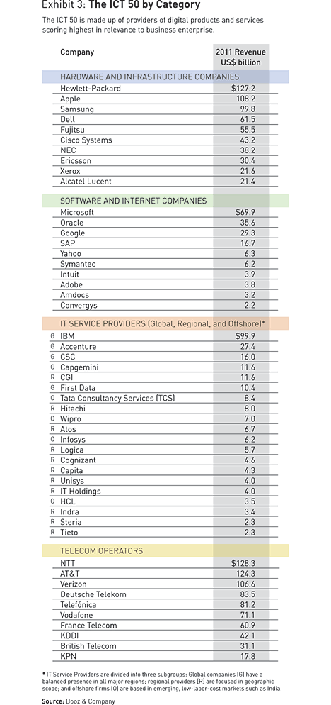 The changing nature of the demand for ICT products and services helps explain why the supply side of digitization is in flux — with more volatility than at any time since the collapse of the dot-com bubble in 2000. The Global ICT 50 study was designed to provide an analytical portrait of that volatility. To our knowledge, it is the first study to examine enterprise relevance for all four sectors together. If some of the rankings seem counterintuitive, that’s because the business-to-business emphasis leads to assessments very different from those of the typical technology press. For example, Apple, with its notable success and high market capitalization, is ranked below HP and Cisco Systems. Google is not even included in the top 10. (See Exhibit 2.) Apple and Google are both remarkable, extraordinarily capable companies, but their impact on corporate ICT purchasing remains relatively low, no matter how many iPads or search engine advertisements are sold. If you are a CIO or an ICT decision maker designing your organization’s approach to digitization, the companies at the top of each category are the ones that are likely to be most relevant to you. (See Exhibit 3.)