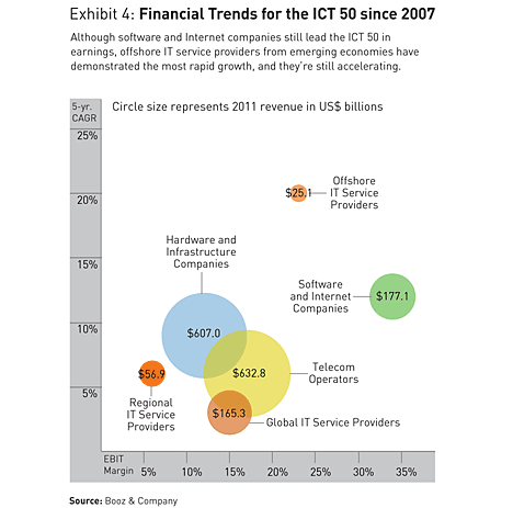 3. IT service providers. Having established themselves over the past 30 years as technology concierges to large- and medium-scale enterprises, these companies offer a variety of services: hosting computers and networks, managing computer applications such as databases, and integrating hardware and software. This sector has three subgroups, each with its own business dynamic. The first is global companies, such as IBM, Accenture, and CSC. They have parlayed their scale into industry leadership positions. Second is regional service providers, such as Atos in France, Logica in the U.K., and Unisys in the U.S., which face a more challenging future. Some are using M&A to increase their scale and market share; for example, Atos bought Siemens IT Solutions and Services in 2011, to create what the announcement called a “European IT champion.” The third subgroup consists of offshore IT service providers based in India, including HCL, Infosys, and Wipro. Starting from a relatively low base, these companies have shown the strongest growth of all the ICT 50 in recent years — more than 15 percent annually, even through the global economic downturn.