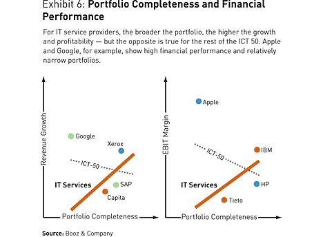 Commentators often overlook a company’s geographic profile — especially its ability to sell and deliver products and services in the industry’s top markets. But this capability is critical to the success of any ICT company with global aspirations. That’s especially evident in the five most highly developed ICT markets — the U.S., the U.K., Japan, Germany, and France. These countries saw combined sales of $1.2 trillion in 2011, more than 60 percent of total global sales of ICT services. Being proficient in sales and delivery in these markets certifies the ability of ICT players to satisfy the needs of the largest corporations. And these markets offer a source of revenue and a profit pool that is too big to be ignored.