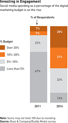 Today, two-thirds of responding companies dedicate 5 percent or less of their digital marketing spending to social media. Within three years, however, 56 percent of responding companies expect to spend 10 percent or more of their digital marketing budgets on social media, and 28 percent expect the figure to exceed 20 percent. (See Exhibit.)