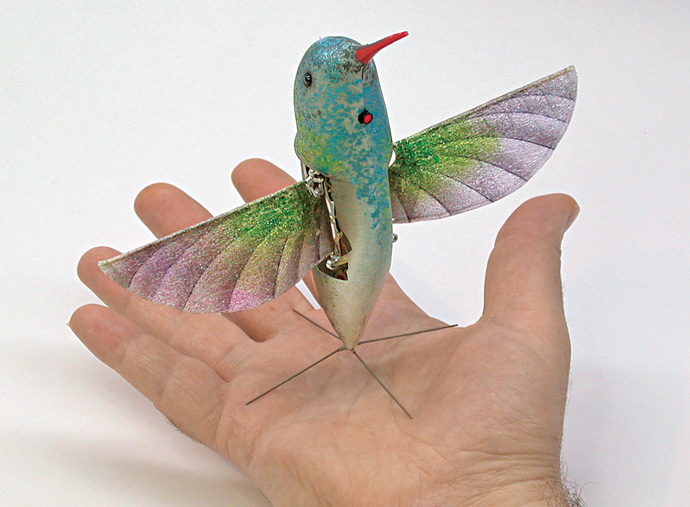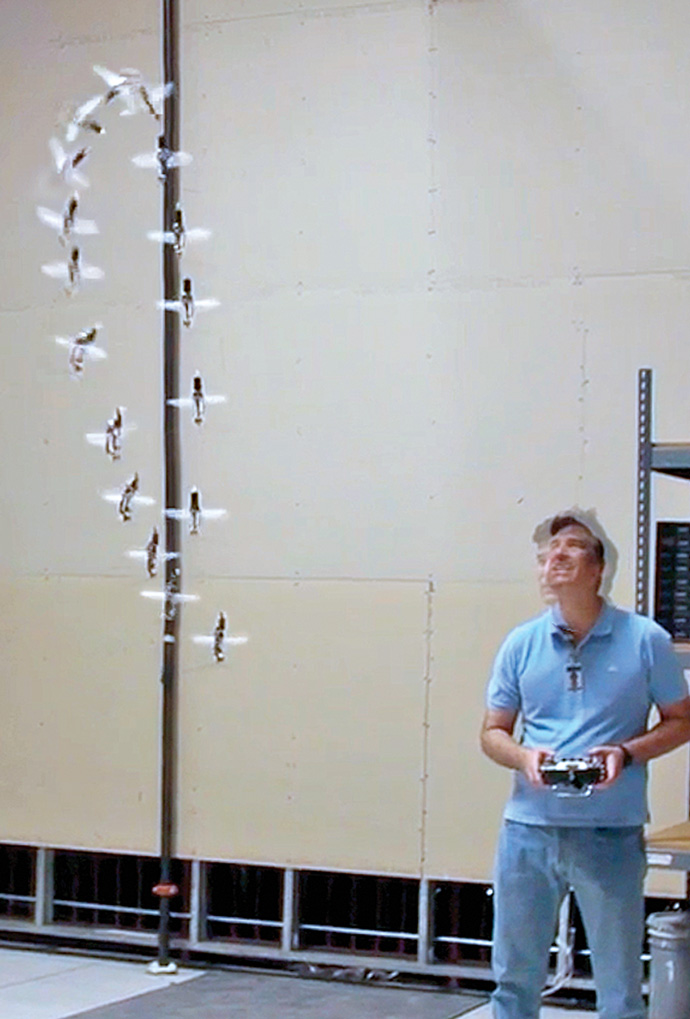 At the other end of the spectrum is the Nano Air Vehicle (NAV), which mimics a hummingbird in its size and flight characteristics. It can hover in place and fly backward and forward in restrictive areas, such as inside a building, that are inaccessible to conventional drones, at speeds of up to 15 miles per hour. It calls to mind flapping-wing ornithopters and pterodactyls—such as the one MacCready’s team built years ago—but actually uses the wing motion of real hummingbirds, a motion that has never been successfully modeled before. The NAV beats its tiny wings a remarkable 70 times per second, with the tips nearly touching, like a hummingbird, but unlike any other winged creature.