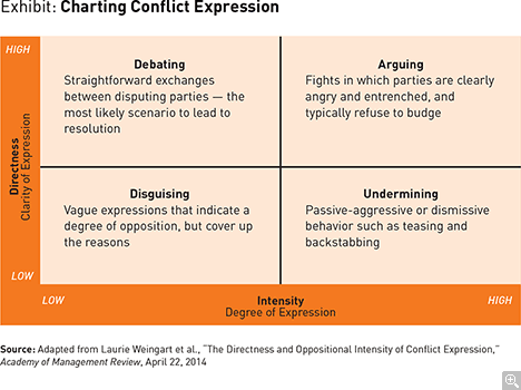 BEHFAR: Yes, when you cross the two dimensions, you get telling patterns, or spirals [see exhibit]. We believe our categorizations of conflict expression apply across cultures. People everywhere use degrees of directness and intensity to communicate opposition. But for this study, we focused on U.S. organizations. This enabled us to assume that people had the same blueprint for how they perceive conflict expression. Even though many workplaces are multicultural, people working in the U.S. become familiar with its behavioral norms.