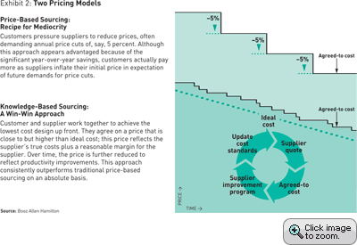No wonder knowledge-based procurement models, and the management philosophy underlying them, are becoming more attractive to many manufacturers. (See Exhibit 1.) Although they are not perfect, the Toyota and Honda sourcing models consistently earn high marks from suppliers — and favorable terms. As one automobile manufacturing executive put it recently, “Honda cost estimators can tell suppliers their own costs within 1 percent accuracy.” That’s meaningful because suppliers are often unable to identify their own manufacturing expenses with anything near this degree of certainty, and thus often suffer overruns. Backed by accurate cost information, automakers and suppliers can jointly develop a performance improvement plan to reach their cost goals.