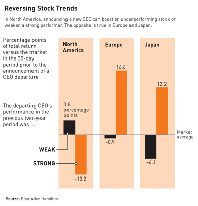 This year, we investigated whether the announcement that a CEO will be replaced has a significant immediate effect on stock price, analogous to the jump that almost always occurs when a merger is announced. Because succession news can leak in the days before the announcement — as is often the case with mergers — we estimated the announcement effect as the returns to investors relative to a broad stock market average over a 30-day period extending through the day of the announcement. The announcement effect of merger-related succession is clear. In the 30 days before a change in CEO is announced, annualized returns to investors for merger-related successions are 117 percent greater than average. But the announcement effects of non-merger-related changes are less dramatic: Returns are 0.8 percent below average for planned successions, and 12.6 percent below average for forced successions. Furthermore, the change in stock price during the announcement period is entirely unrelated to how well the newly appointed CEO performs during his or her full tenure. Apparently, the stock market is no better at anticipating the ultimate performance of a CEO than is the board of directors. It’s how well the CEO does in improving a company’s performance, not the CEO’s characteristics coming into the job, that drives returns to investors. In North America, announcing the replacement of the CEO produces a positive effect (3.8 percentage points better than the average return) when a company has been performing poorly for two years and a negative effect (10.2 percentage points worse than average) when the company has been doing well — exactly the pattern one would expect if investors believe that the new CEO will deliver average results. In Europe and Japan, the announcement produces the opposite effect. Perhaps the difficulty of bringing about significant immediate change in Europe and Japan is the cause: In North America, the normally negative returns during the announcement month at a poorly performing company are more than offset by the expectation that a new CEO will make changes that produce a big upside, whereas in Europe and Japan the normally negative returns balance the expected upside from change. The one consistent announcement effect is that selection of an outsider produces a big downtick in stock price; selection of an insider triggers an uptick. This probably reflects investors’ assumptions that the outsider is taking over a poorly performing company, or that an insider will generally produce better returns for investors — assumptions that have been consistent throughout our study. The pattern for outsiders brought in from other industries — typically the CEOs most expected to shake up a company — is consistent with our hypothesis. Industry outsiders enjoy a positive announcement effect (outsiders from within the industry have an extremely negative effect) and a positive effect during the 30 days following the announcement, as expectations continue to rise that they will bring beneficial change. However, because of the difficulty outsiders face in driving growth and changing the culture, industry outsiders produce very negative returns in the month before they are replaced (whereas outsiders from within the industry enjoy positive returns).