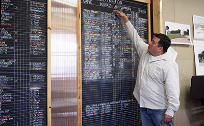 Above/Below: Michael Grote, program manager of Architecture for Humanity, in front of the project board, the heart of the center’s design area. Each new home project is tracked in terms of volunteer group assignments, permit and construction status, and funding.