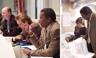 Above: Executive Director Bill Stallworth attends a Biloxi council meeting and then returns to the center to review construction plans with a GCCDS staffer.