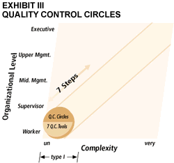 In terms of the complexity map, it seems fair to say that the first 20 years of T.Q.M. activity in Japan were focused in the lower left hand corner. The teams were Q.C. circles, the method was seven steps and the tools were the seven Q.C. tools. The problems that they solved were additive, noninteractive and static in nature. I call them Type I problems. (See Exhibit III.)