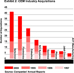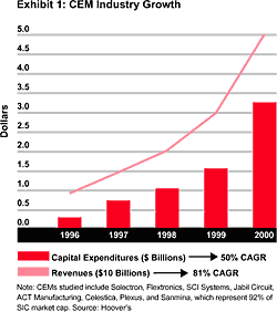 We studied eight major CEMs — Solectron, Flextronics, SCI Systems, Jabil Circuit, Celestica, ACT Manufacturing, Plexus, and Sanmina — that together represent 92 percent of the Standard Industrial Classification market cap. From 1996 to 2000, capital expenditures grew 11-fold, revenues increased almost 400 percent (see Exhibit 1), and market capitalization experienced an exhilarating compound annual growth rate of 87 percent. The Solectron Corporation itself is a lesson in CEM expansion. (See Exhibit 2.) In 1997, it extended its presence with just one new acquisition. In 1998, it picked up another five; in 1999, 10; and, in 2000, it surpassed the total number of acquisitions in the previous three years with 27.
