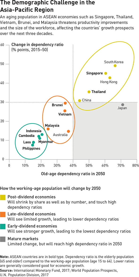 However, as other countries in the region have found, there is another side to the demographic story: an aging population. Vietnam is a case in point. The third most populous country in ASEAN, it is also one of the most rapidly aging countries in the world. In 2017, one in every nine people, or 11 percent of Vietnam’s population of 95 million, was age 60 or older. According to the government statistics office, that proportion will rise to about 20 percent by 2038. The International Monetary Fund forecasts that neighboring Thailand faces the likelihood that by 2050 its old-age dependency ratio (those 65 and older as a share of those between 15 and 64) will rise to more than 50 percent, up from 15 percent today — a development that will noticeably shrink the country’s working-age population. This structural shift points to an emerging drag on ASEAN’s growth prospects, because it spells a net decline in working-age populations in some of its leading economies (see “The Demographic Challenge in the Asia-Pacific Region”). In short, some countries have a limited demographic window available to maximize economic growth.
