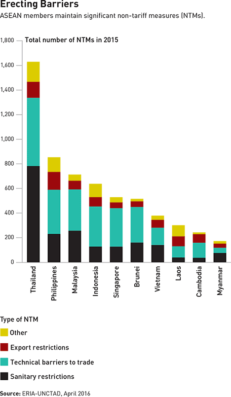 The good news is that 96 percent of tariff lines and 70 percent of intra-ASEAN trade flows are currently tariff free. But customs and levies aren’t the only factors that inhibit trade. The elephant in the room in this context is the many non-tariff barriers in the region — the result of the steady implementation by ASEAN member-states of non-tariff measures (NTMs). There has been a consistent rise in the number of NTMs, which are often aimed at bolstering domestic companies and industries, and which have stifled intraregional activity (see “Erecting Barriers”). This mix of import- and export-related policies has grown substantially, from 1,634 measures in the year 2000 to a high of 5,975 measures in 2015 across ASEAN. In terms of the type of NTMs, 43 percent are import restrictions related to technical product requirements; 33 percent take the form of sanitary measures related to public health and safety; and 13 percent are export-related restrictions. As an example of an NTM in ASEAN, a company certified to sell halal food products in Malaysia needs to undergo recertification to export to Indonesia, to adhere to the Indonesian industry’s halal standard — which has significant time and cost implications for the exporter. Similarly, the Thai government imposes stringent licensing requirements for the import of raw materials, petroleum, industrial machinery, textiles, pharmaceuticals, and agricultural items.