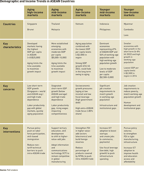 The second set of measures would be for member countries to tackle, head-on, their shared demographic challenges in productivity and aging populations. Given that countries are at different stages of development and face different degrees of demographic challenge, these measures should include short-term policy interventions such as addressing talent gaps through encouraging inward migration, and long-term reforms targeted at improving the labor force participation of women and older people. For example, in fast-aging markets such as Singapore and Thailand, only 60 percent of women participated in the workforce in 2017, compared with 77 percent of men. Specific interventions will also need to target a range of other levers, including human capital, trade, technology, and investments, which will vary by market in ASEAN (see “Demographic and Income Trends in ASEAN Countries”).