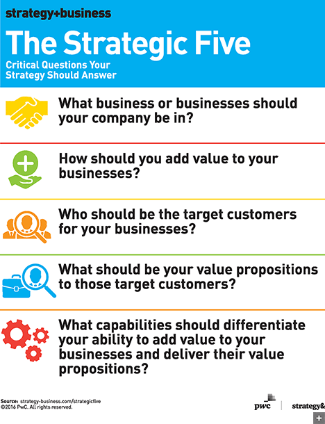 Great strategies answer five critical questions (“the strategic five”) in ways that are unique to your company: (1) What business or businesses should your company be in? (2) How should you add value to your businesses? (3) Who should be the target customers for your businesses? (4) What should be your value propositions to those target customers? (5) What capabilities should differentiate your ability to add value to your businesses and deliver their value propositions?