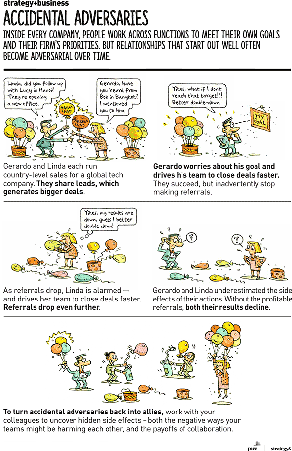 Turning accidental adversaries into allies requires effort and tough conversations. But the alternative is continued deterioration. For example, in Linda’s and Gerardo’s case, here’s what actually happened: Linda and Gerardo started out with the intent to share leads. Then, senior leaders focused more and more attention on forecasts, which in turn created added pressure to close deals quickly (and thus, locally) — leaving the entire region falling short. Luckily, once you and your colleagues recognize you are stuck in accidental adversaries mode, it is not as hard as it seems to break free. The best place to start is by understanding and addressing the side effects of your own actions.