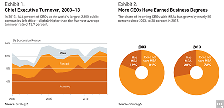 Today’s CEOs run companies with considerably flatter hierarchies than those of the 1960s. And they come armed with experiences (“passport stamps”) that are more likely than ever to include an MBA—sometimes an executive MBA earned on the job—and a variety of work roles at several different kinds of companies (perhaps including consulting firms). Indeed, in 2013, three in four incoming chief executives had worked for multiple organizations, and 35 percent had worked in regions other than where their companies were headquartered—although just one in five hailed from a country other than their organization’s home base. (For more details on the latest incoming CEO class, see “CEO Turnover in 2013”.)