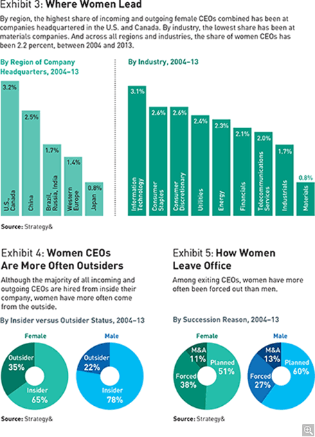We’ve studied CEO successions and new CEOs at the world’s largest 2,500 public companies for the past 14 years. This year, for the first time, we’re performing an in-depth analysis of our data on the women who have either taken up or left the top office during those years. There aren’t too many—only 118 out of more than 6,000 incoming and outgoing CEOs—but we believe that looking at who’s coming and who’s going helps us understand what boards are looking for in CEOs.