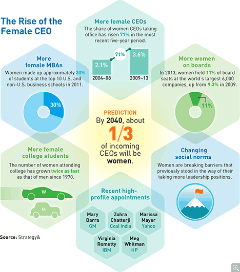 As of this writing, 60 percent of U.S. college students, and some 40 percent of MBA students, are women. Those are high percentages, and we expect them to hold, if not rise. Based on several data trends and the continued falling of barriers, we estimate that by 2040—a quarter century from now, when today’s college and business school graduates will be taking the CEO reins—women will represent some 30 percent of the incoming class of the top 2,500 global CEOs. (See “Women CEOs: A Slow but Steady Upward Trend.) And that proportion will only increase over time.