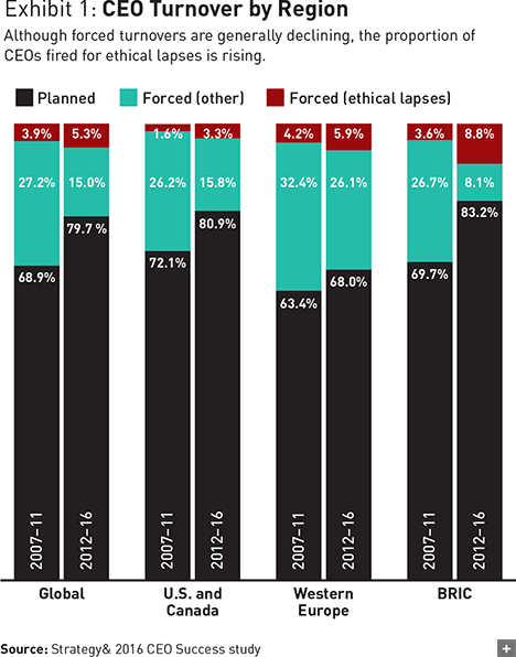 However, dismissals for ethical lapses increased significantly over the last five years — on a global basis and in each of the three major regions we analyze: the U.S. and Canada; Western Europe; and Brazil, Russia, India, and China (the BRIC countries). The share of all successions attributable to ethical lapses rose sharply in the U.S. and Canada (from 1.6 percent of all successions in 2007–11 to 3.3 percent in 2012–16), in Western Europe (from 4.2 percent to 5.9 percent), and in the BRIC countries (from 3.6 percent to 8.8 percent; see Exhibit 1).