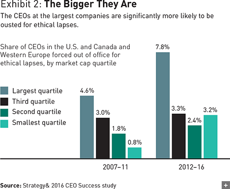 To be sure, the number of CEOs who are forced from office for ethical lapses remains quite small: There were only 18 such cases at the world’s 2,500 largest public companies in 2016. But firings for ethical lapses have been rising as a percentage of all CEO successions. (We define dismissals for ethical lapses as the removal of the CEO as the result of a scandal or improper conduct by the CEO or other employees; examples include fraud, bribery, insider trading, environmental disasters, inflated resumes, and sexual indiscretions. See “Methodology,” below.) Globally, dismissals for ethical lapses rose from 3.9 percent of all successions in 2007–11 to 5.3 percent in 2012–16, a 36 percent increase. The increase was more dramatic in North America and Western Europe. In our sample of successions at the largest companies there (those in the top quartile by market capitalization globally), dismissals for ethical lapses rose from 4.6 percent of all successions in 2007–11 to 7.8 percent in 2012–16, a 68 percent increase.