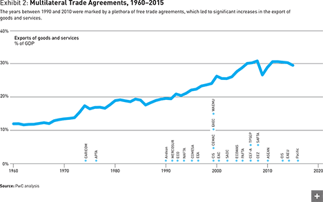 Partly through the influence of these four events and partly as an extension of the previous two decades’ logic, the years between 1990 and 2010 were marked by a plethora of free trade agreements of one kind or another (see Exhibit 2). This helped streamline bureaucracies and spawned greater overall economic integration. Billions of potential workers and therefore consumers became accessible globally.