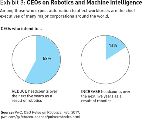 Technology has changed its trajectory as well. We are moving from an online world that has facilitated much greater human interaction to one that will enable things to communicate with each other, and decisions to be made with artificial intelligence. In a recent global survey of CEOs conducted by PwC (see Exhibit 8), the vast majority of respondents said robotics and machine intelligence would significantly remove labor from their workforce over the next few years. The scale of information flow and the speed of transmission have also added to the strain felt by existing institutions. These are not just Western issues; a labor glut is likely to appear in China and India as well. According to the International Federation of Robotics, quoted in the Economist in March 2015, the public and private sector in China purchased 20 percent of all the robots made in 2013.