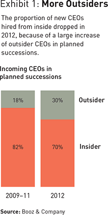 The way that companies bring their new CEOs on board has changed significantly over the years. In 2012, 29 percent of the companies in a planned chief executive transition followed an apprenticeship model, a model in which the outgoing CEO remains or becomes chairman and thus can help “apprentice” the incoming CEO. Of the companies that chose this model, 85 percent chose an insider as CEO, far higher than the number that chose outsiders. The data suggests that these companies are seeking continuity through their chief executive transition.