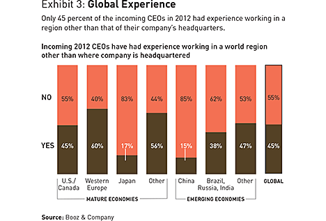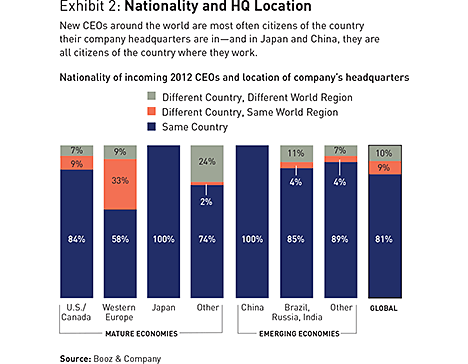Just because a larger portion of 2012’s class of CEOs come from outside the company, however, does not mean that they bring a different regional perspective. Fully 81 percent of incoming chief executives, both insiders and outsiders, are natives of the country in which the companies hiring them are headquartered (see Exhibit 2). As you might expect, that number varies depending on geography. For Chinese companies in 2012, all incoming CEOs came from China. For Japanese companies, they all came from Japan. For western European companies, just 58 percent of the new CEOs in 2012 came from the country where their companies are based. Another 33 percent came from another European country.