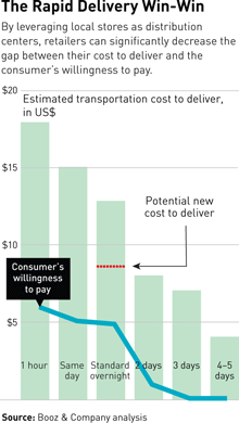 Managing bricks-and-mortar stores has so consistently been framed as a disadvantage that it’s easy to underrate the value of physical proximity to customers. In reality, these stores may be just the advantage retailers need to gain an edge over their online competitors. A handful of retailers are already experimenting with the “store-to-home” concept, mostly to move out-of-season stock and leverage idle sales capacity—but not to fulfill orders in the evenings and get them to the customer’s door the next day. As Amazon, eBay, and Google push aggressively into rapid delivery, traditional retailers must not hesitate to respond. The storefront advantage is real, but it’s not permanent. ![]()
