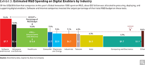 Even as companies overall are making significant use of many digital tools, variations among companies in different industries remain considerable. Overall, software and Internet companies spent the largest portion of their R&D budget on deploying and operating digital tools, at 15 percent, followed by aerospace and defense companies, at 12 percent.