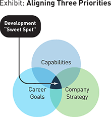 In partnership with the high potentials, identify which of their strengths can be leveraged and which weaknesses need to be mitigated in light of their career goals. Help them answer the question, “What type of assignments will help me build the capabilities I need while adding value to the company?” I think of the intersection of capabilities, career goals, and the company’s strategic interests as the development “sweet spot” (see Exhibit).