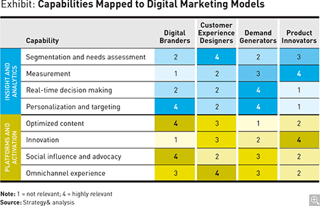 It’s virtually impossible to be great at all of the digital marketing capabilities we’ve identified. That’s why each company must focus only on the capabilities that align best with its digital marketing model. There is a link that connects the company’s strategy, the digital marketing model it needs, and the marketing organization and marketing capabilities required to succeed with that model. The capabilities necessary to succeed as a Digital Brander will be different from those required by a Demand Generator. This is not an ironclad relationship—there are multiple paths to success, and even companies pursuing the same Demand Generator model, for instance, may choose to emphasize different capabilities. But in general, certain models require that the company have a specific set of supporting capabilities (see Exhibit).