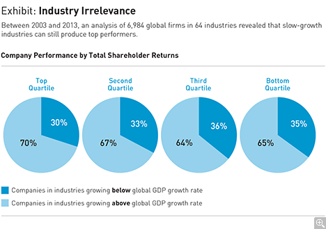 In our analysis of shareholder returns over the last few decades, we found the phenomenon of superior performance to hold true in every industry, in every part of the world, and over every time period that was long enough to allow the leaders to become apparent. Between 2003 and 2013, for instance, 30 percent of companies with top-quartile shareholder returns (our proxy for success) were in industries growing at or below the rate of GDP. Even industries at the bottom of the heap produced their share of top performers (see Exhibit).