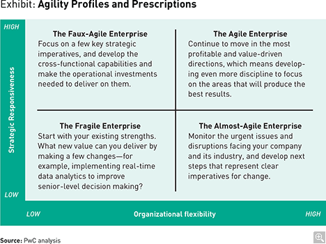 Agile companies have both high strategic responsiveness and high organizational flexibility. Their leaders accept the inevitability of change. They have mechanisms in place for sensing potentially disruptive forces and taking advantage of them before the competition. The rest of the organization understands the value of rapid action; people are practiced and confident, with the skills and infrastructure support they need. Although the company encourages experimentation, it also resists unnecessary complexity: At any time, there are just a few new initiatives, backed by everyone in the company. There is also a strong network effect—people share the insights from experiments and customer engagement up and down the hierarchy.