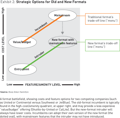 In contrast, new-format companies create a different and better menu for themselves by operating in strikingly new ways that slice out slabs of cost. (See Exhibit 2.) The new format can deliver either a high or low level of features and amenities less expensively than the old format. Format invaders thus represent a long-term threat to the mainstream traditional companies in the sector, unlike other companies that merely pitch their offerings at the “value” end of the market.