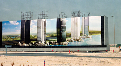 | A billboard in Dubai, photographed in 2007, shows an image of the buildings under construction behind it. |