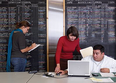 Above: In the center’s meeting rooms, designers and case managers work out blueprint and funding details with clients.