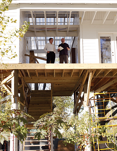 Above: GCCDS Director David Perkes, in the white shirt, shows Lawrence Frascella a new house designed in Biloxi’s vernacular “dog trot” style (with an open breezeway between sections of the house).