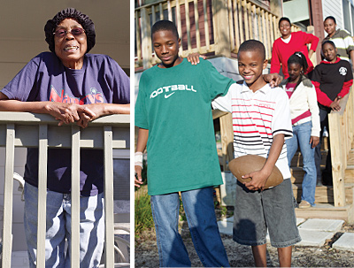 Above left: Patience Harris on the porch of her new home, built by the GCCDS. Above right: After two years of living in a trailer, Karen Parker and her children are ready to move into the first model home completed by Architecture for Humanity.