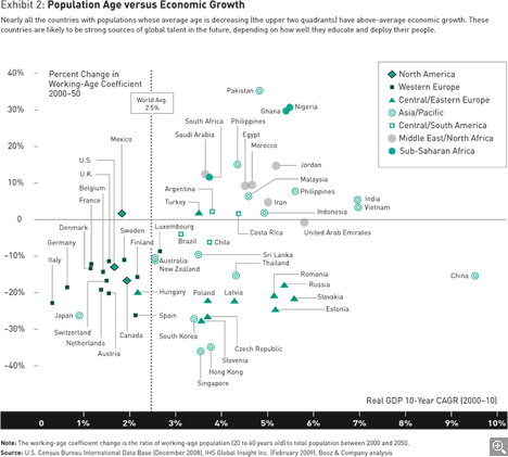 “This program helps us capitalize on talent that is reflective of the global environment and different from the traditional mold,” says JoAnn Heffernan Heisen, chief diversity officer of J&J. Companies are similarly adapting to generational shifts, which vary by region. In the mature economies of Europe, Japan, and North America, the “demographic bulge” of the baby boom generation (born between 1946 and 1964, currently ages 45 to 63) is beginning to move out of the workforce. The swelling ranks of retirees, low birth rates (particularly among the college educated), and caps on immigration are all factors that will fuel a reduction of between 20 and 40 percent in the working-age population over the next few decades. Meanwhile, in transitional economies such as China, India, Brazil, and Russia, talent markets vary widely. India benefits from both high GDP growth and a young, highly skilled workforce, whereas China and Russia both confront a shrinking pipeline of young workers. All these countries need better-educated entry-level talent to sustain strong growth. (See Exhibit 2.)