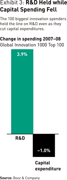 Not all companies, of course, maintained or boosted R&D spending. More than a quarter of the Global Innovation 1000 cut their innovation budgets in 2008. And many companies were cautious: The top 20 innovation spenders increased research and development by only 3.2 percent, compared with 10.7 percent for these companies in the previous year. Furthermore, the early evidence indicates that as companies entered 2009, spending on innovation slowed further. Again, however, that slowdown came in the face of even steeper declines in sales and income: Among the 522 companies reporting results for the first quarter of 2009, R&D spending decreased by 7.4 percent — which is still less than half the rate of their 18.5 percent decline in sales. Also noteworthy is that as the biggest R&D spenders have evaluated their investment strategies in the downturn, they have continued to invest in R&D at a higher rate than they have in capital expenditures. (See Exhibit 3.)