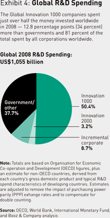 Even during the recession, the companies in this year’s Global Innovation 1000 study increased their R&D spending in 2008 by 5.7 percent, to US$532 billion. This is significantly less than 2007’s 10 percent increase over the prior year, but it is close to the 7.1 percent five-year compound annual growth rate for the Global Innovation 1000. R&D spending rose in 2008 despite the fact that almost a third of the companies in our study reported net losses for the year, and overall sales were up just 6.5 percent, considerably less than the prior year’s 10 percent increase. R&D intensity in 2008 — the percentage of sales devoted to R&D — remained the same as in 2007 for these companies, at 3.6 percent. We estimate that this year’s total spend of the Global Innovation 1000 companies represents 81 percent of global corporate R&D spending of approximately $660 billion, and a little more than 50 percent of total worldwide R&D spending, including that of governments, of $1.05 trillion. (See Exhibit 4.)