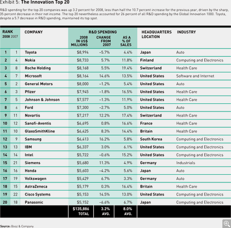 The Toyota Motor Corporation was the #1 spender on R&D for the third straight year, with a budget of just under $9 billion. The company maintained its rank despite its first-ever loss, more than $4.3 billion in 2008. Toyota’s R&D spending was 5.7 percent lower, however, than it was in 2007. The #1000 company on our list was the Laird Group PLC, a London-based maker of electronics equipment, which spent $58 million on R&D. The top 20 companies increased R&D spending just 3.2 percent in 2008, compared to 10.7 percent in the prior year — no doubt because net income among the 20 fell from $115 billion in 2007 to just $75 billion in 2008, a startling 35 percent drop. (Even subtracting the General Motors Corporation’s 2008 loss of more than $30 billion, net income for the group fell 9 percent.) Still, the top 20 spenders accounted for 26 percent of spending by the entire Global Innovation 1000. Three companies fell out of the top 20: Matsushita was acquired by Panasonic; Merck and Sony were replaced by Siemens and Cisco Systems, both of which boosted R&D spending in 2008 by more than 10 percent. (See Exhibit 5.)