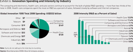 The downturn has taken a major toll on the worldwide economy, and the companies that make up the Global Innovation 1000 have certainly not been immune to its impact. Overall, they spent $532 billion on R&D in 2008, a healthy 5.7 percent increase over 2007, but well below the 10 percent increase from 2006 to 2007. Total sales were up 6.5 percent, to $15 trillion — but again, it was a significantly smaller increase than the 10 percent gain this same group registered between 2006 and 2007. Thus the group’s R&D intensity — innovation spending as a percentage of sales — remained the same at 3.6 percent. And our analysis shows, as it has every year over the last five years, that the amount of money companies spend on R&D bears no relationship to overall corporate performance.