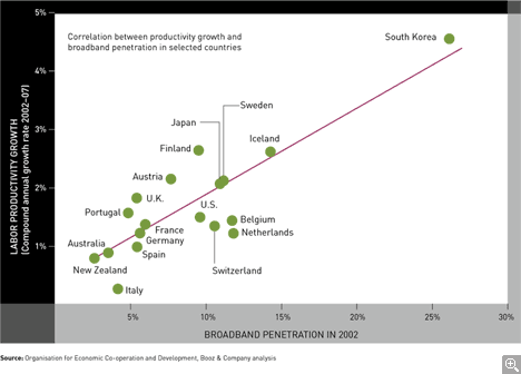 As companies and nations make investment decisions about the next generation of broadband networks, they should consider the correlation between the faster transfer of information and economic growth. Analysis by Booz & Company found that higher rates of broadband penetration in 2002 were closely related with higher labor productivity over the next five years. The full Booz & Company report is “Digital Highways: The Role of Government in 21st-Century Infrastructure.”