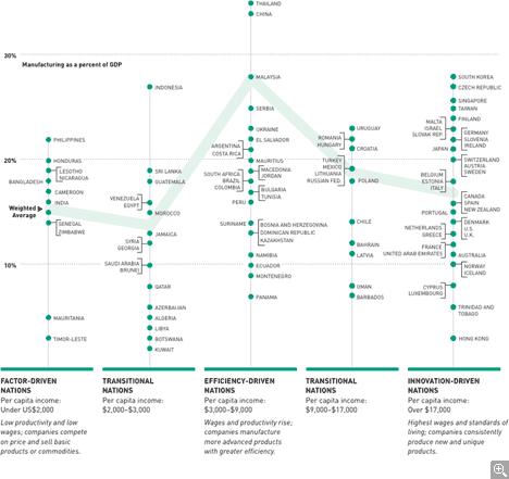 How big a role does manufacturing play in a nation’s economic output? On average, share of GDP rises as countries move from the low to the middle stage of economic development (from “factor-driven” to “efficiency-driven,” as defined by the World Economic Forum). But as national economies evolve to the “innovation-driven” stage, manufacturing’s share tends to decline. One likely reason: Product research, engineering, and design tend to remain in developed countries, but manufacturing flows to lower-cost nations.