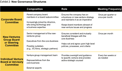 New corporate governance structures also ease friction. Several companies we surveyed and interviewed have named special board-level committees to ensure a strategic focus on the e-business/new business development process. They're also forming dedicated new-ventures steering committees to set policy for new-venture groups and ensure that they maintain consistent and mutually beneficial linkages with core businesses.