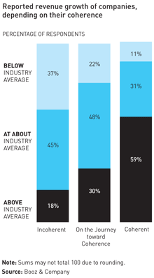 The underlying problem these survey responses reveal is a lack of coherence, as the term is defined by Booz & Company Partners Paul Leinwand and Cesare Mainardi in The Essential Advantage: How to Win with a Capabilities-Driven Strategy (Harvard Business Review Press, 2011). A coherent company has a deliberately close alignment among the company’s strategic direction, its most distinctive capabilities, and most or all of its products and services. These survey results suggest that all too few companies enjoy the benefits of that alignment. The results also show the potential payoff that a more coherent approach can deliver: Companies that rate highly on coherence — those whose executives report that their strategy, capabilities, and product offerings are in sync — consistently outperform others.