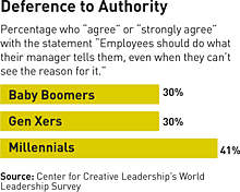 The reality: The idea that millennials are not willing to comply with authority is flat-out wrong. Our research shows (unexpectedly, I must admit) that millennials currently in the workforce are more willing to defer to authority than either baby boomers or Gen Xers. Specifically, in a sample of more than 5,000 respondents, millennials were more likely than boomers and Gen Xers to agree with statements such as “Employees should do what their manager tells them, even when they can’t see the reason for it.” One possible explanation for this behavior has to do with the coaching millennials received from their parents and teachers growing up: They learned at a young age that doing what an authority figure tells them is more likely to result in success (“what do I need to do to get an A?”), and therefore believe that doing what their managers tell them will have the same effect.